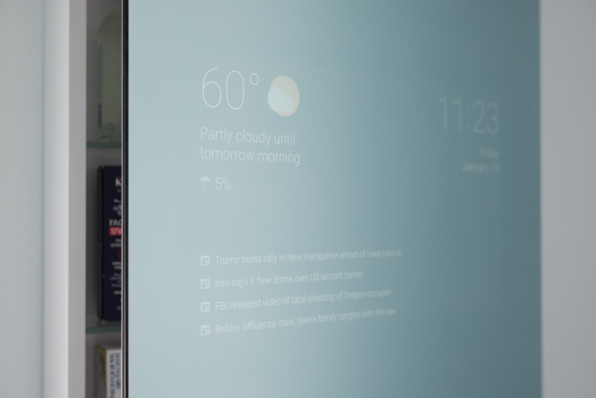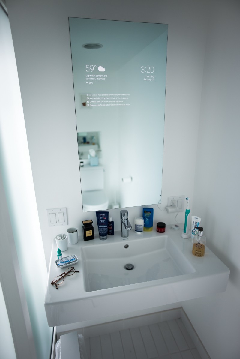 Considerando que o espelho da casa de banho é um ponto de passagem "obrigatório" todas as manhãs, facilmente se percebe o interesse de nele poder ver aquilo que provavelmente costumam espreitar no smartphone. Embora aqui não se tenha um sistema touch para interagir com o espelho, podemos fazê-lo usando comandos de voz (e não seria muito complicado aplicar-se uma câmara para detecção de gestos... sendo que isso seria obviamente criticado no caso de ser um produto do Google, pois já se imaginam as reacções a ter uma câmara na casa de banho!)